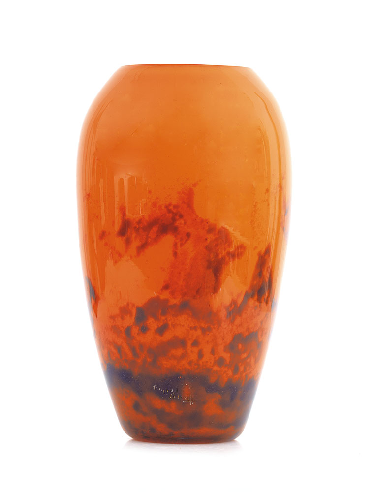 VASO IN VETRO DOPPIO, MULLER FRERES, 1930 CA, ovoidale maculato nei toni dell'arancio, firma al getto di sabbia "Muller F.re".