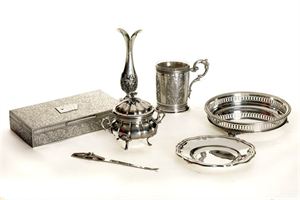 LOTTO DI ARGENTI Lotto di oggetti in argento composto da: scatola da gioco con interno in legno, bicchiere con manico e cristallo molato, zuccheriera, piattino, piccolo vasetto da fiori , piccolo centro tavola con piedini e tagliacarte Peso dell'argento esclusa la scatola gr. 877 Lot of silver consisting of: box game with wooden interior, glass and cut crystal handle, sugar bowl, saucer, a small pot of flowers, a small center table with knives and feet Weight of silver ruled the box gr. 877