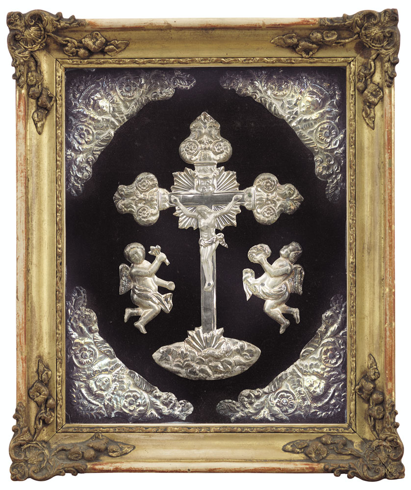 PANNELLO CON CROCEFISSO E ANGELI IN ARGENTO, XIX SECOLO, fregi e placche sbalzate applicate su supporto in velluto, teca coeva; usure.
