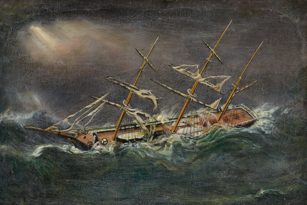 Lotto 584 | PITTORE DEL XX SECOLO Marina in burrasca con naufragioOlio su tela, cm...