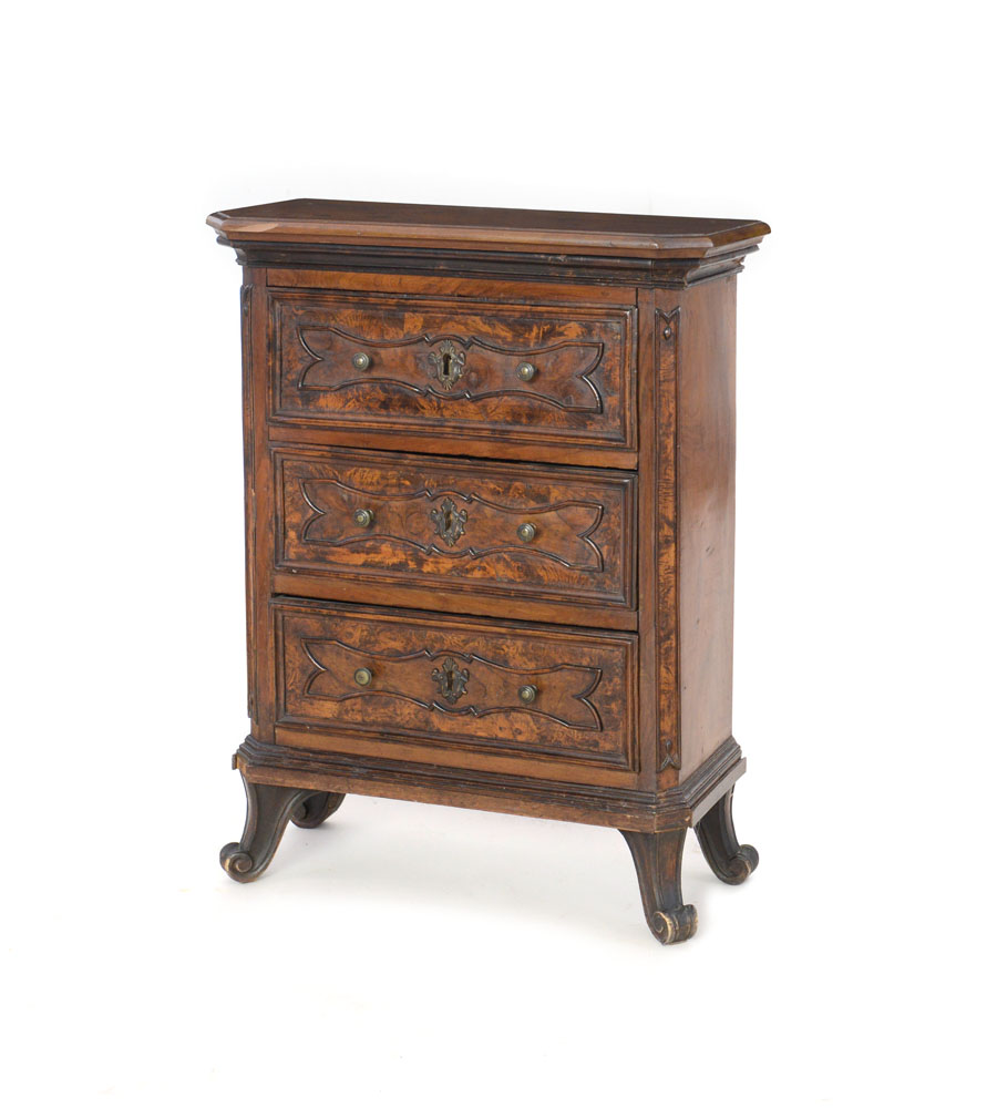 MOBILETTO IN NOCE E RADICA DI NOCE CON ELEMENTI DEL XVIII SECOLO, a tre cassetti con cornicette applicate e piedi a mensola; modifiche, sbeccature e usure.