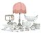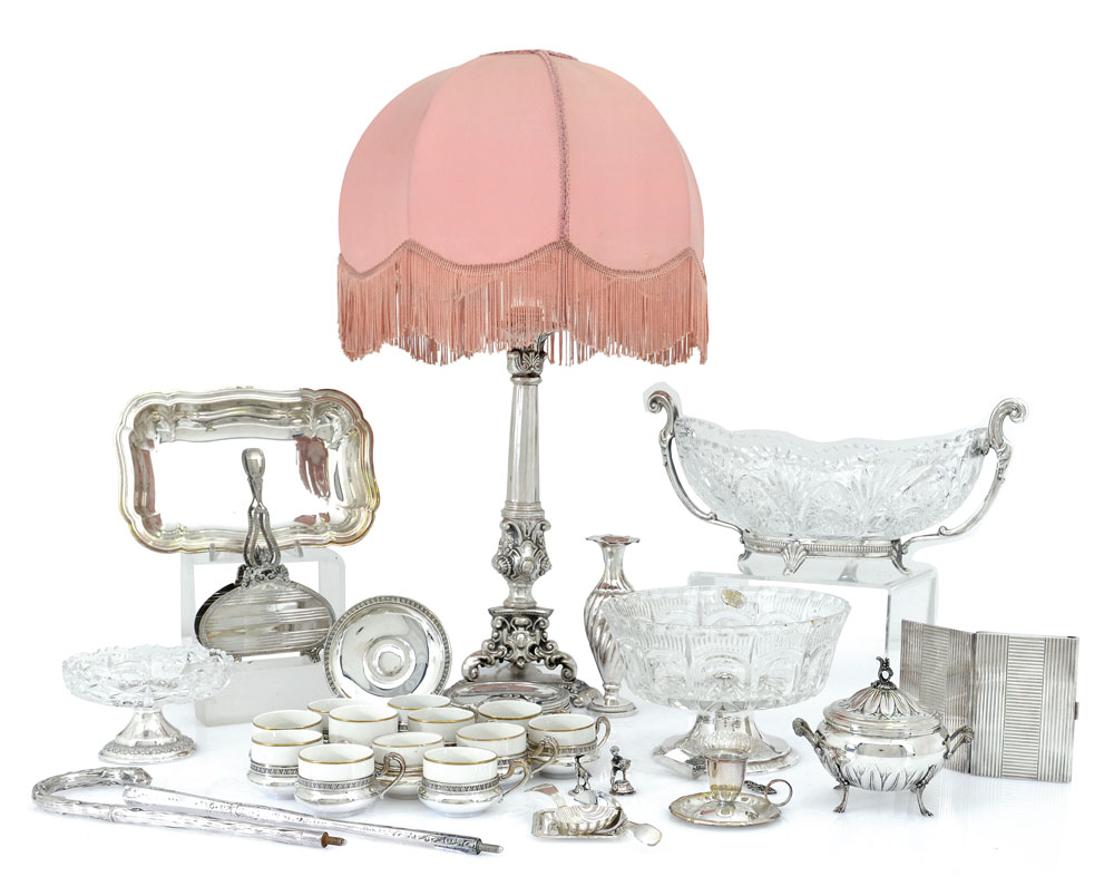 LOTTO DI DIVERSI OGGETTI IN ARGENTO, XX SECOLO, composto da una lampada con paralume in tessuto, tre centrotavola con parti in cristallo, un portasalviette, un vasetto, una zuccheriera con coperchio, due manici per ombrello, un centrotavola, una bugia, alcune piccole posate e diverse tazze con parti in porcellana e piattini.