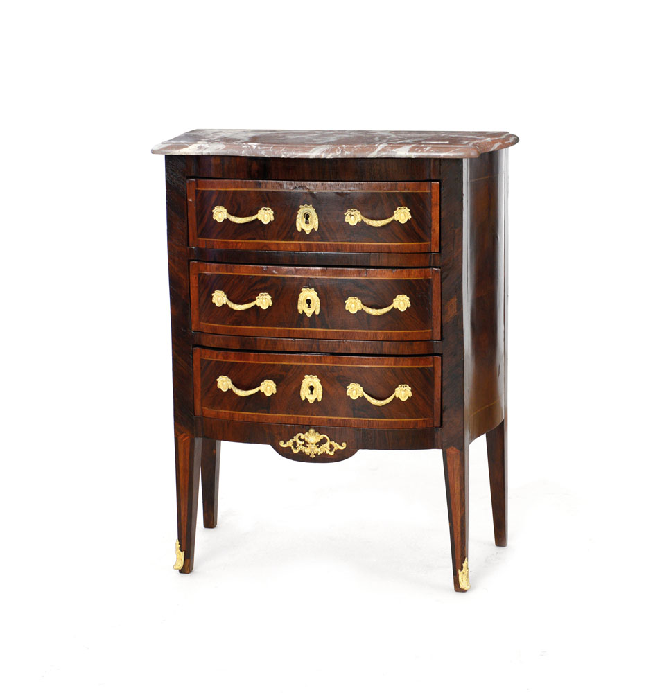 PICCOLO CASSETTONE INTARSIATO, XIX SECOLO, fronte mosso con piano in marmo rosso, decori ad intarsio a filettature geometriche; usure e sbeccature.