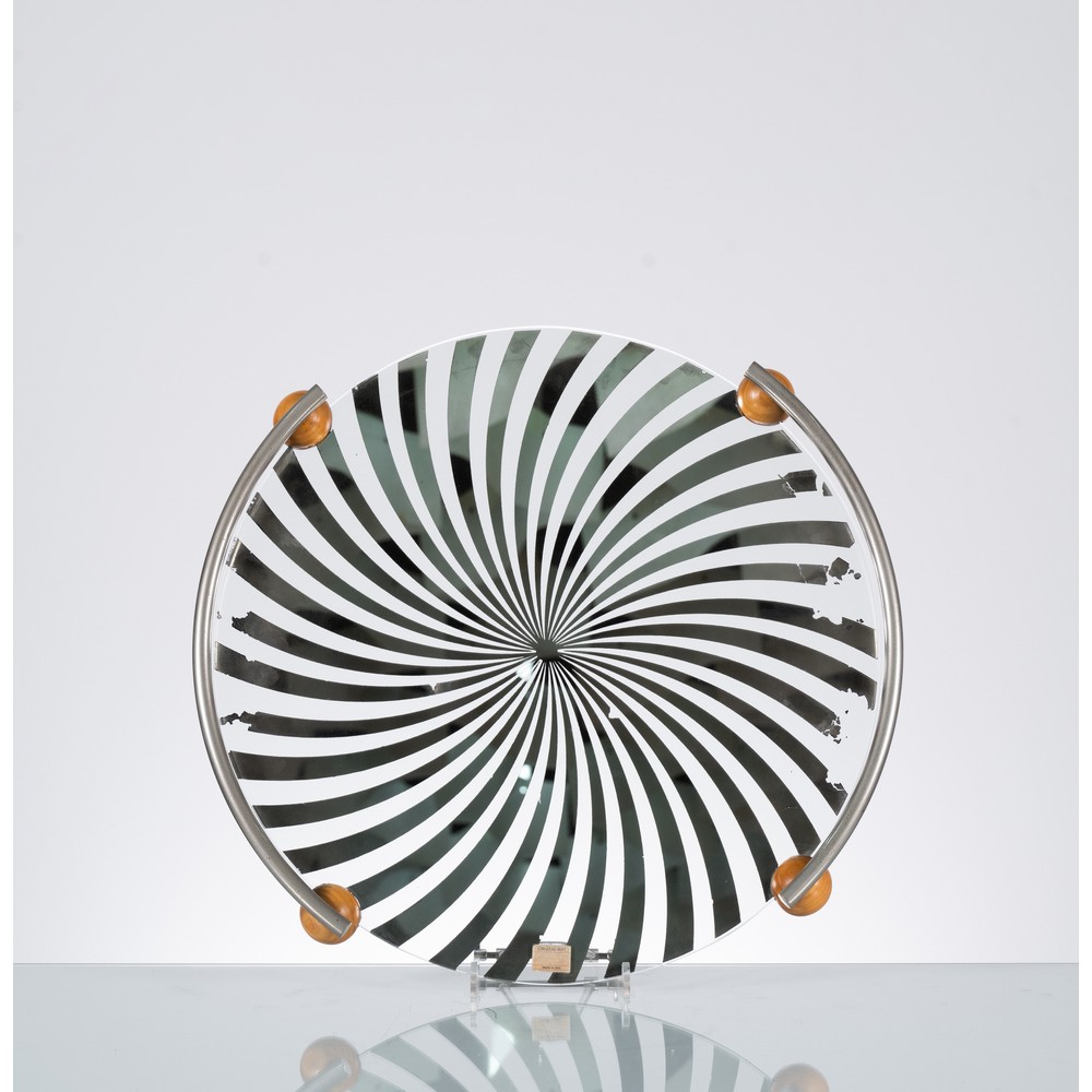 Centrotavola circolare in vetro incolore e decorato con argentature concentriche elicoidali, quattro piedi sferici in legno e manici in metallo cromato. Difetti alle argentature.