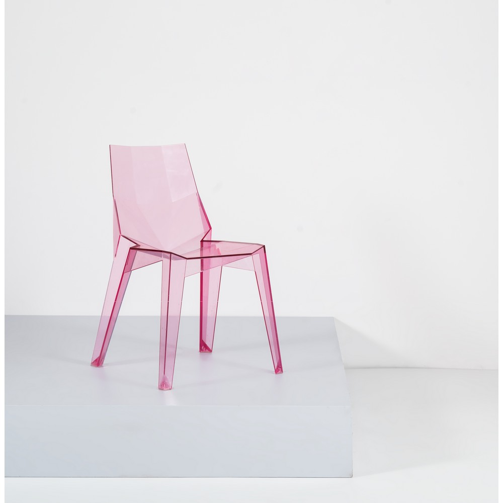 Sedia in plexiglass lilla, seduta e spalliera sfaccettate.