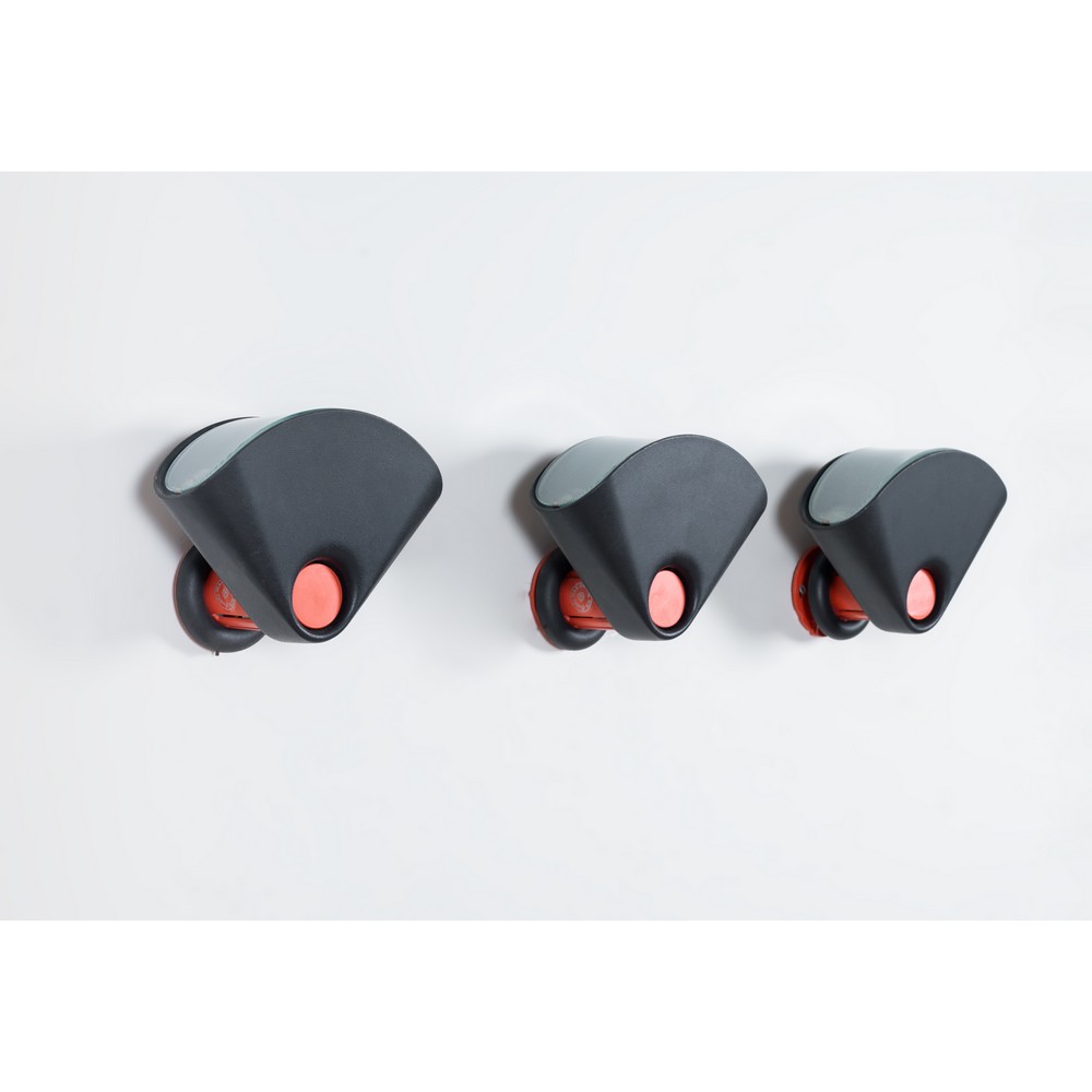 Tre lampade da parete ad una luce modello 'Bollo 870', diffusore e supporto in metallo verniciato nero e rosso con vetro curasto. Marchio di produzione.