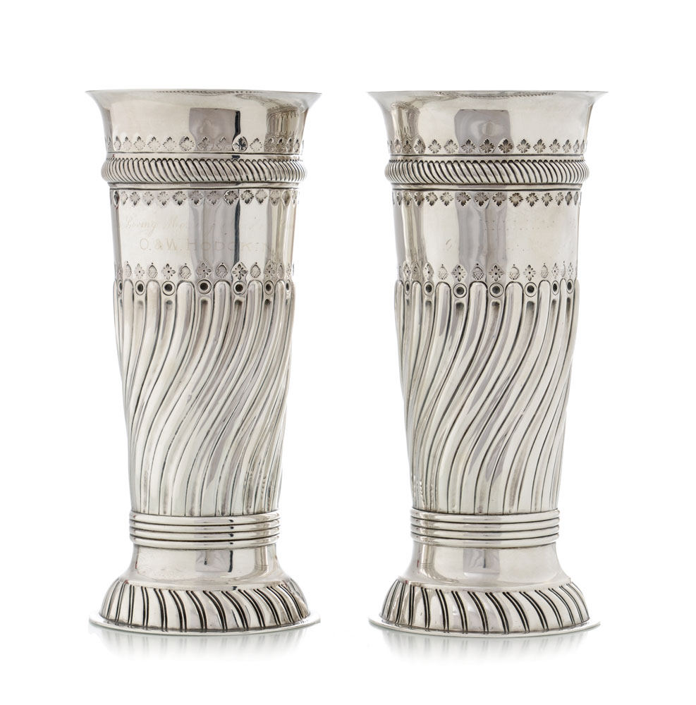 COPPIA DI VASI IN ARGENTO, LONDRA, 1894, tronco conici sbalzati a baccellature ondulate e scanalature incise.