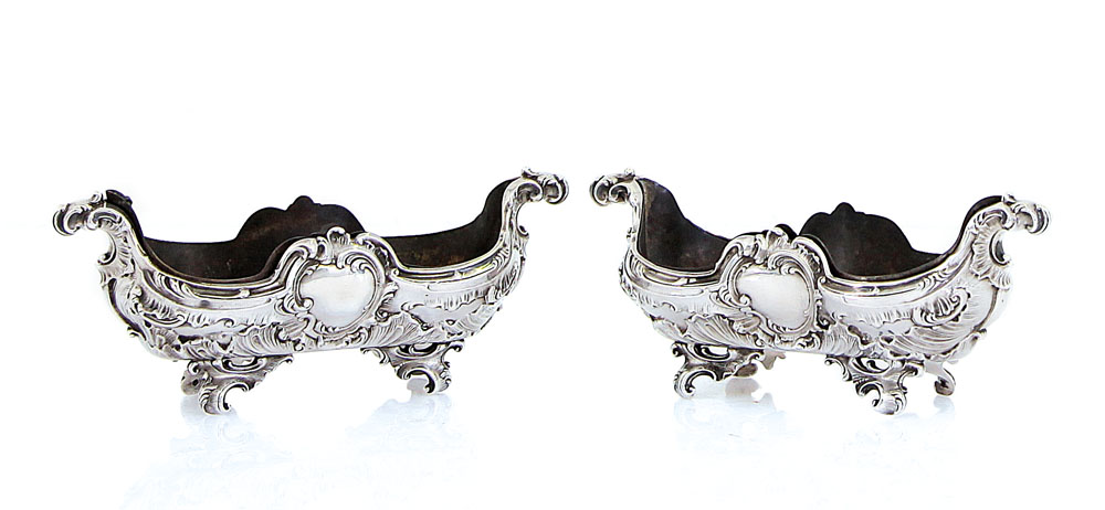 COPPIA DI FIORIERE IN ARGENTO, FRANCIA, FINE XIX SECOLO, sagomate biansate a rocaille su piedini, vaschette interne in metallo; difetti.