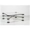 Tavolo basso con struttura in ferro verniciato nero, gamba cilindrica in vetro satinato lavorato a torchon, centrale sferico in vetro satinato, piano quadrato in cristallo trasparente, crociera in metallo verniciato.