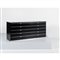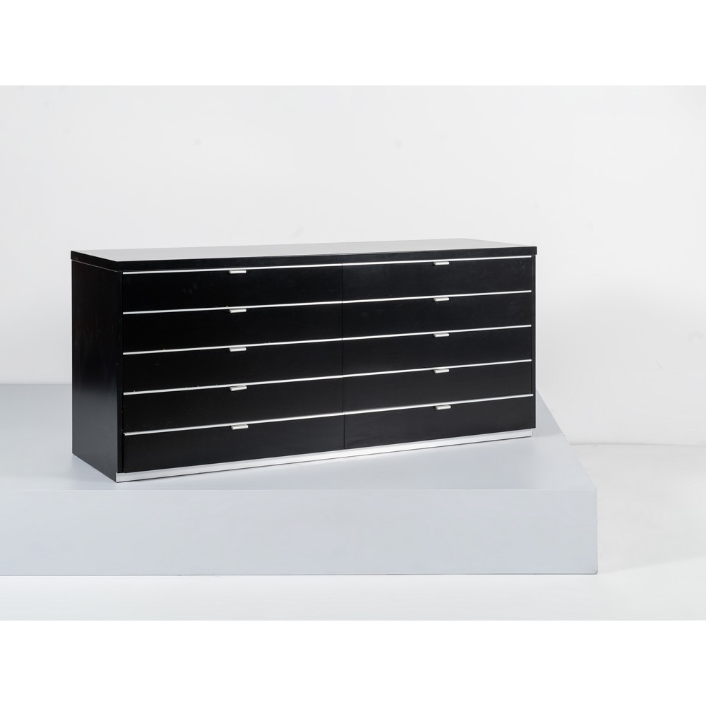 Cassettiera in legno laccato nero, piano rettangolare, sul fronte dieci cassetti con maniglie e listelli in acciaio satinato. Segni di utilizzo.