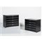 Coppia di cassettiere in legno laccato nero, piano rettangolare, sul fronte cinque cassetti con maniglie e listelli in acciaio satinato. Segni di utilizzo.