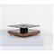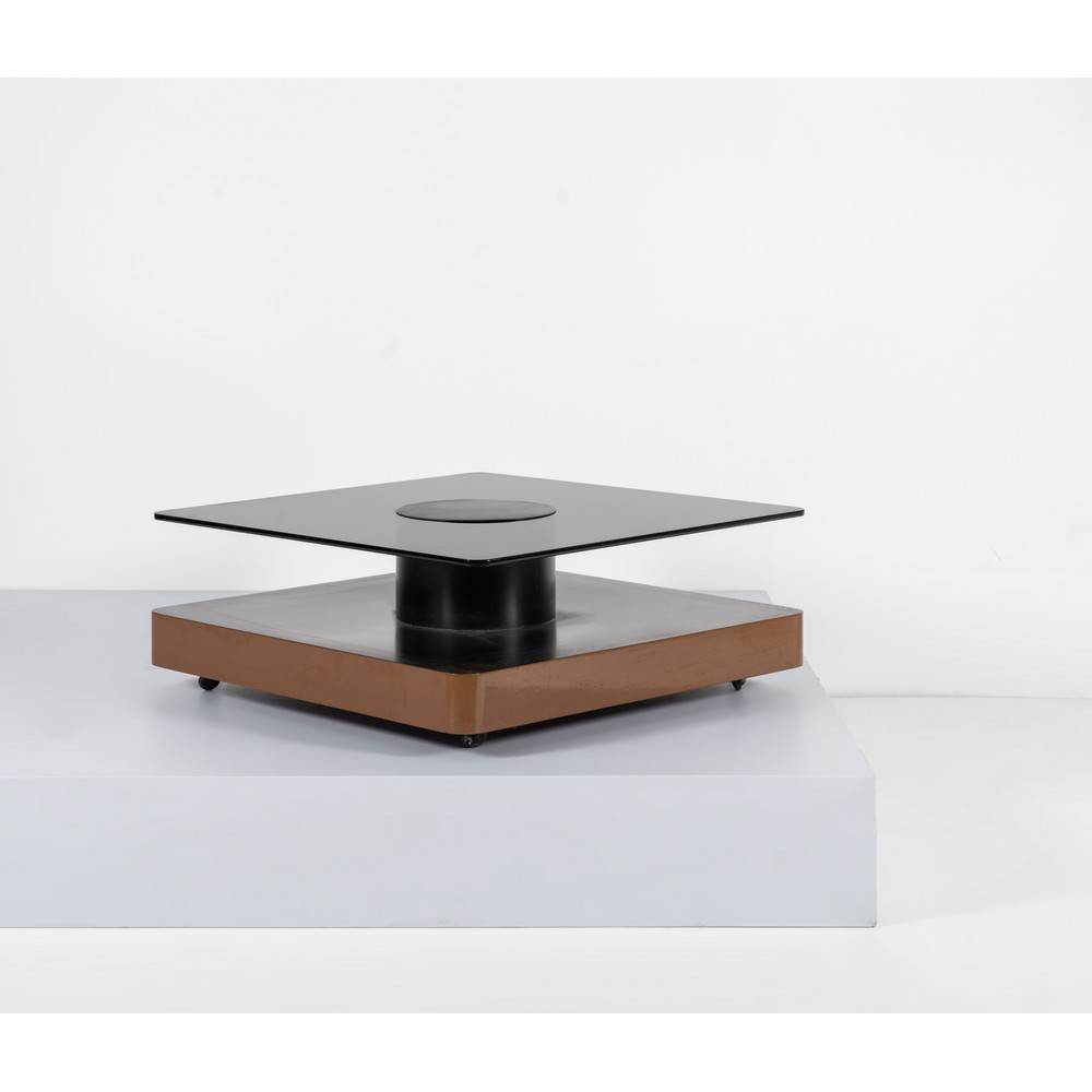 Tavolo basso con piano girevole quadrato in vetro fumè, cilindro centrale in metallo, base in legno verniciato marrone.
