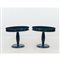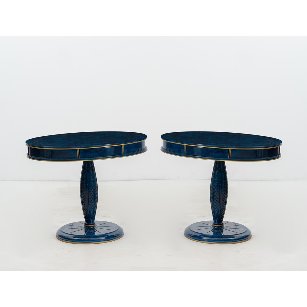 Coppia di comodini con struttura in legno e finitura ad effetto lapislazzuli e lumeggiature in oro, piano ovalizzato con piccolo cassetto centrale sul fronte, piede ellittico decorato con motivi vegetali, base circolare.