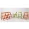 Sei sedie pieghevoli con struttura in legno, seduta a doghe, quattro di colore arancione e due verde mela.