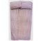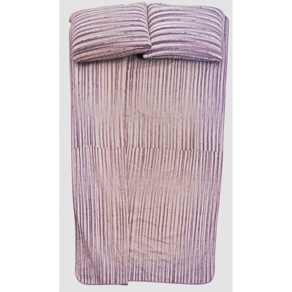 Un copriletto matrimoniale leggermente imbottito in tessuto a telaio nei toni del lilla e blu, due cuscini rettangolari con imbottitura.