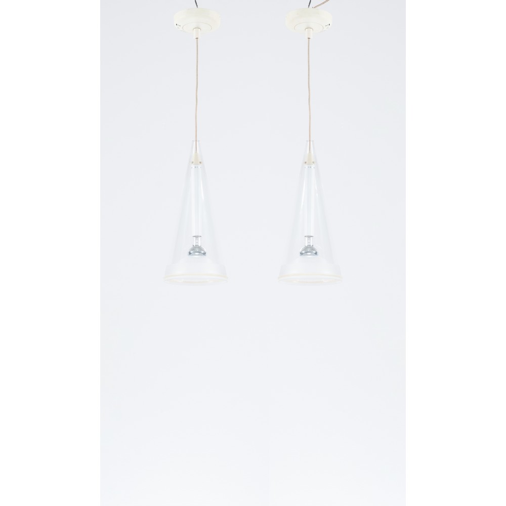 Coppia di lampade a sospensione ad una luce modello 'Fucsia' con diffusore conico in vetro incolore e fascia di bordura satinata. Marchio di produzione.