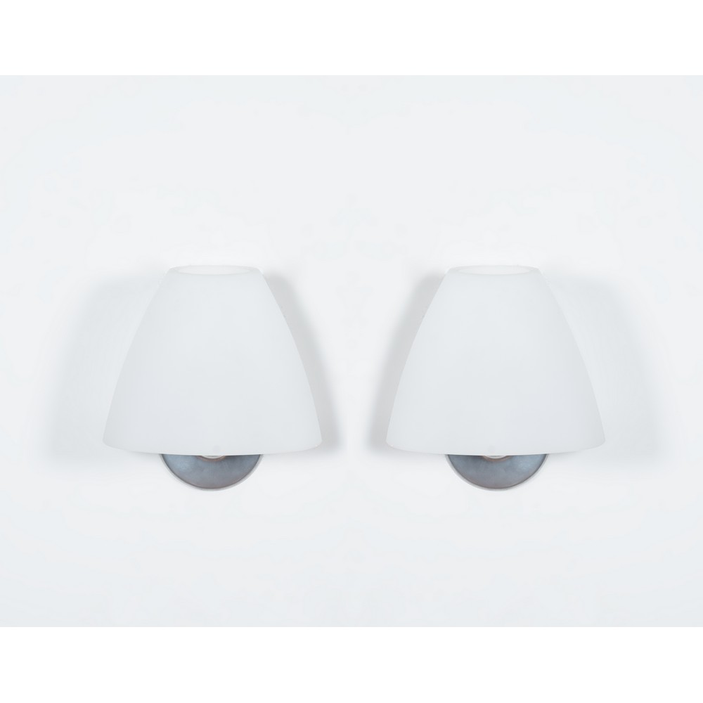 Coppia di lampade da parete ad una luce modello 'Sally', struttura in alluminio con diffusore in vetro satinato opale. Etichetta di produzione.