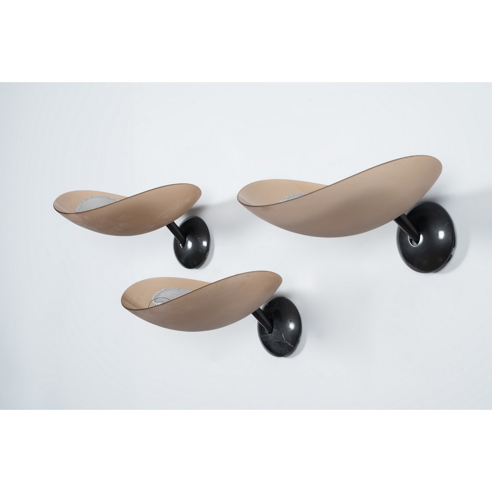 Tre lampade da parete ad una luce modello 'Tebe' con struttura in metallo e policarbonato nero, diffusore curvato in vetro di murano satinato marrone. Marchio di produzione.