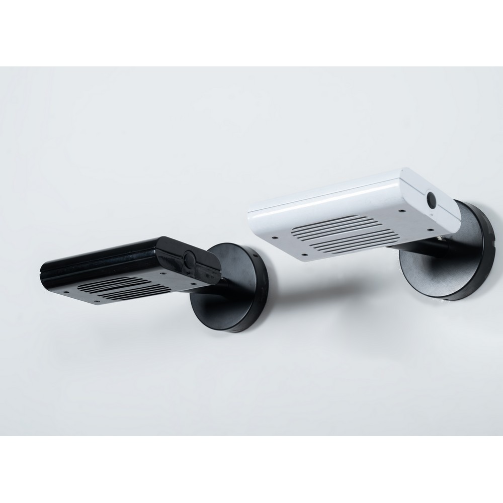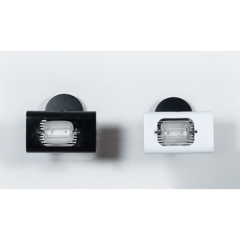 Due lampade da parete ad una luce modello 'Aton' con struttura in metallo e diffusore orientabile rettangolare, una verniciata nera, l'altra grigia. Marchio di produzione.