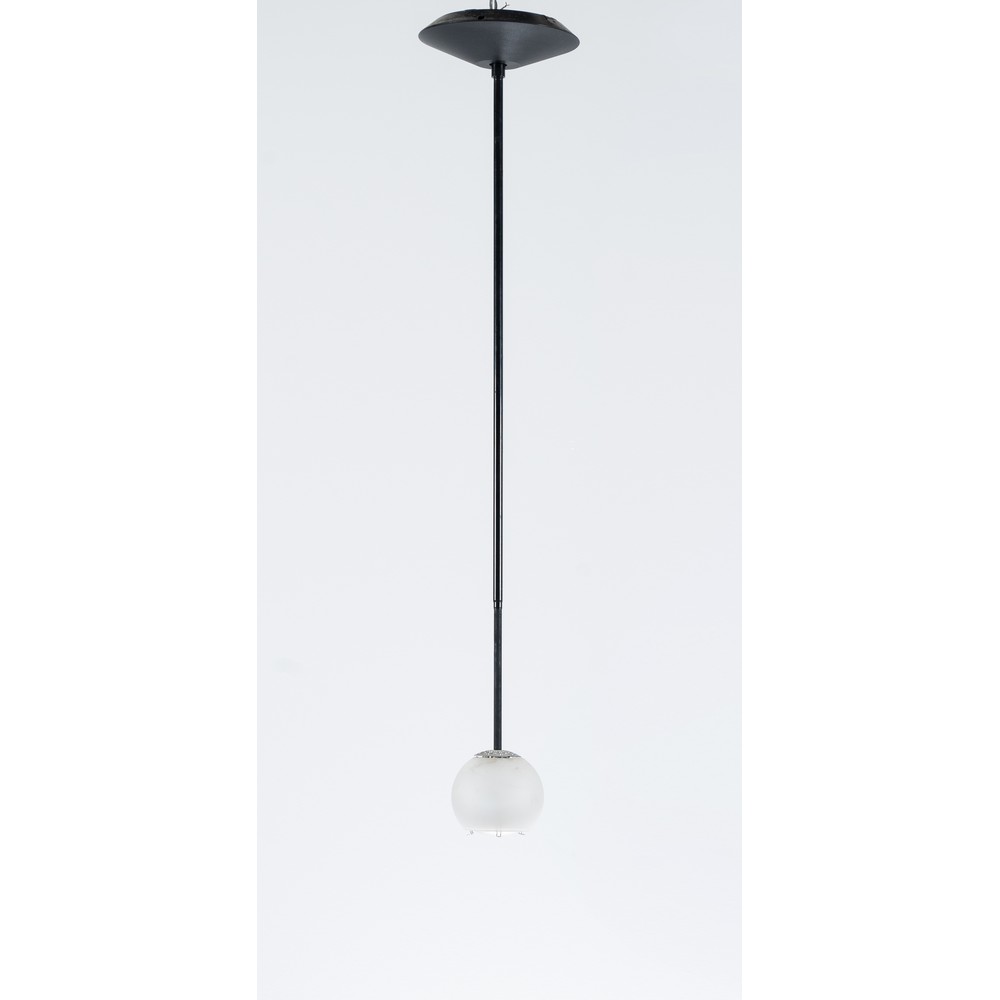 Una lampada modello "Phonix" ad una luce con struttura allungabile in metallo verniciato nero, diffusore sferico in acciaio e vetro satinato opale.