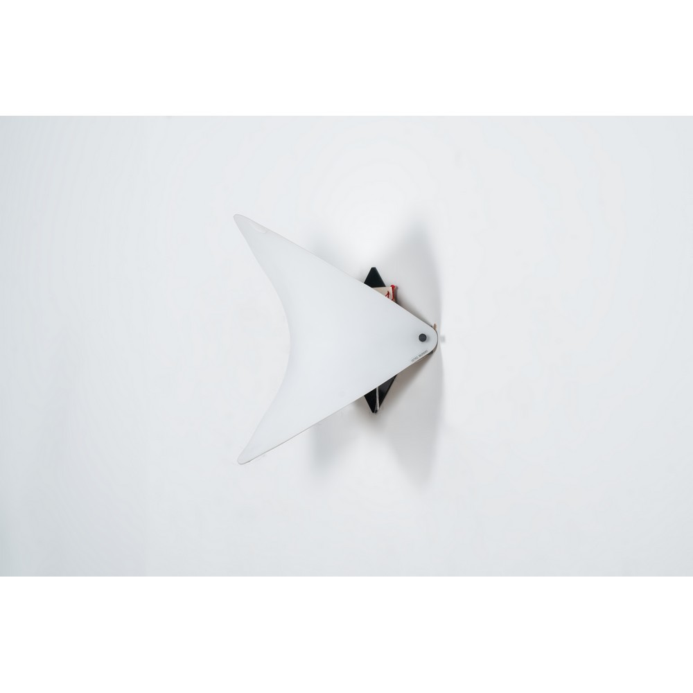 Lampada da parete ad una luce modello 'Randa', struttura in metallo verniciato nero, diffusore in vetro ricurvo a vela satinato bianco. Etichetta di produzione.