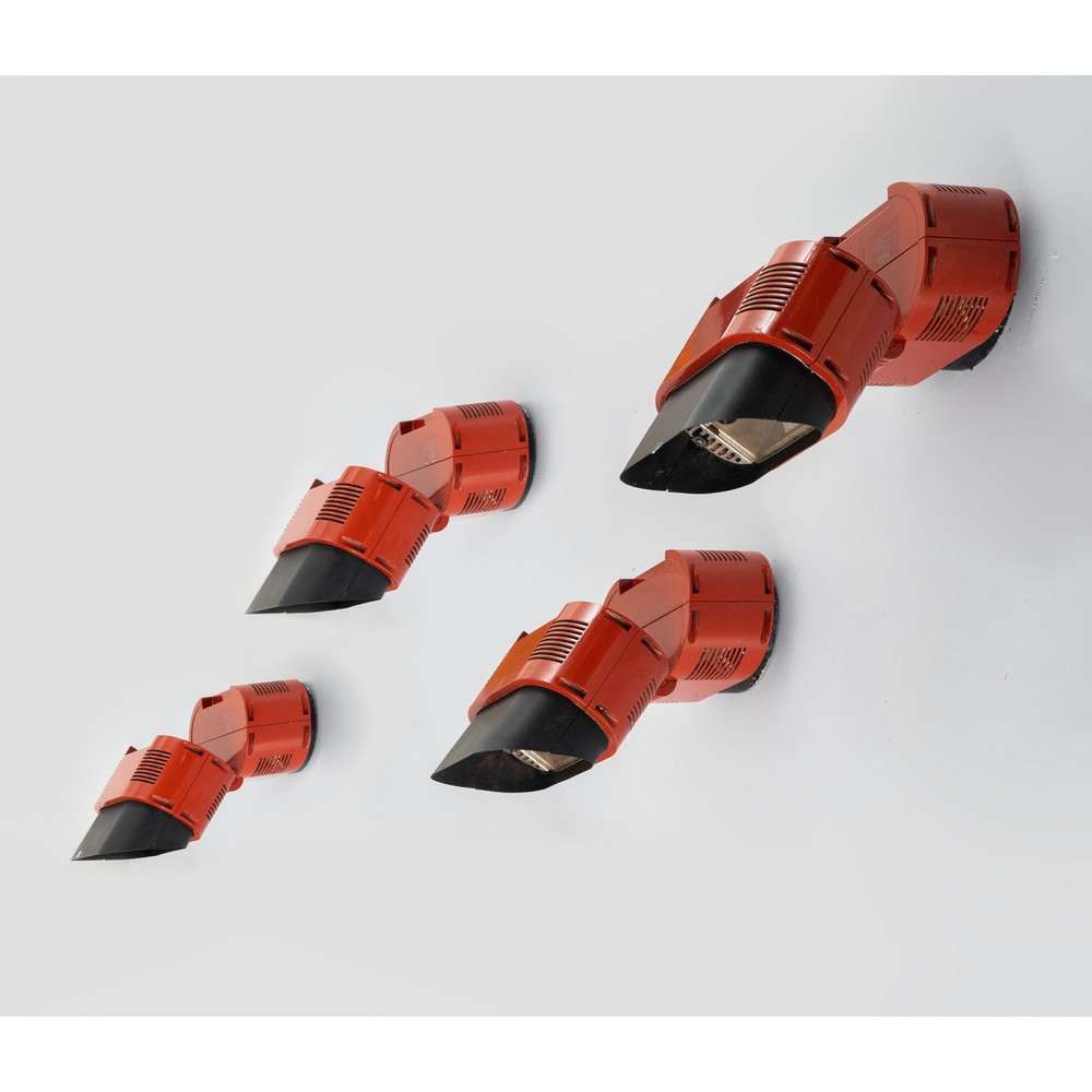 Quattro lampade da parete ad una luce modello 'Giove' con struttura in metallo verniciato rosso, diffusore in metallo verniciato nero e vetro. Marchio di produzione.