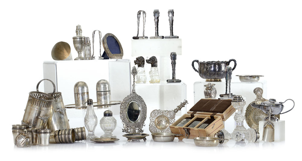 LOTTO DI DIVERSI OGGETTI IN ARGENTO, XIX-XX SECOLO, composto da dodici bicchierini, un cofanetto con piccoli lingotti, due diversi colini traforati, uno specchio, un portagrissini, sei pinze, due salini messicani, una lucerna, tre ciotoline, due piattini, un salino a balaustro, una saliera doppia, un piccolo portafoto, un cucchiaino, un cono, una zuccheriera, due porta posate, quattro salini e un flacone in cristallo e argento; difetti e mancanze.