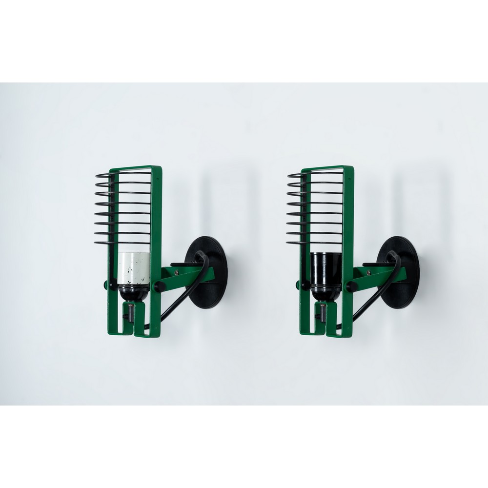 Coppia di lampade da parete ad una luce modello 'Sintesi' in plastica e metallo verniciati verde e nero. Marchio di produzione.