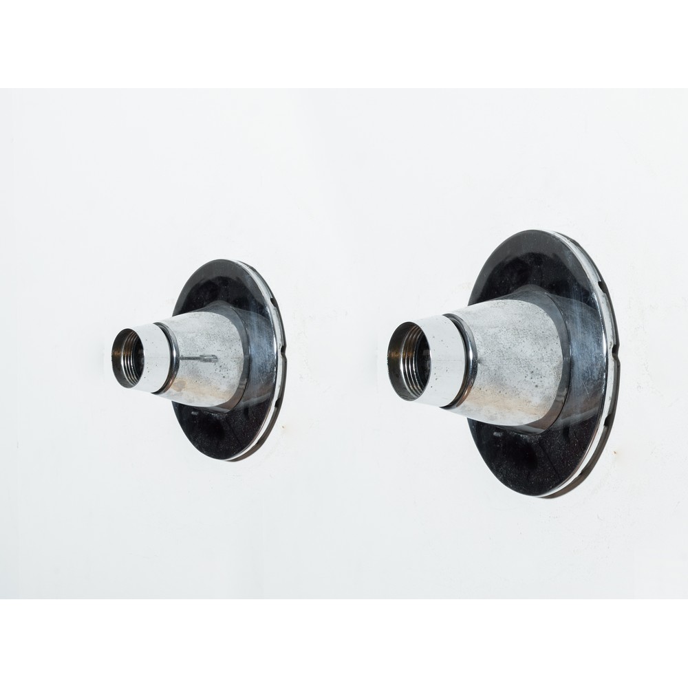 Coppia di lampade da soffitto o parete ad una luce, corpo circolare con diffusore tronco piramidale in metallo cromato.