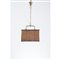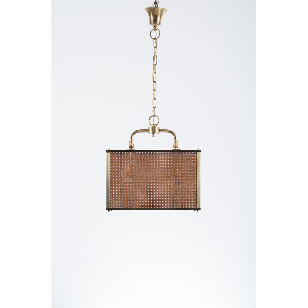 Lampada a sospensione a due luci con struttura in metallo dorato, diffusore a parallelepipedo in plexiglass trasparente e midollino intrecciato. Lievi ossidazioni.