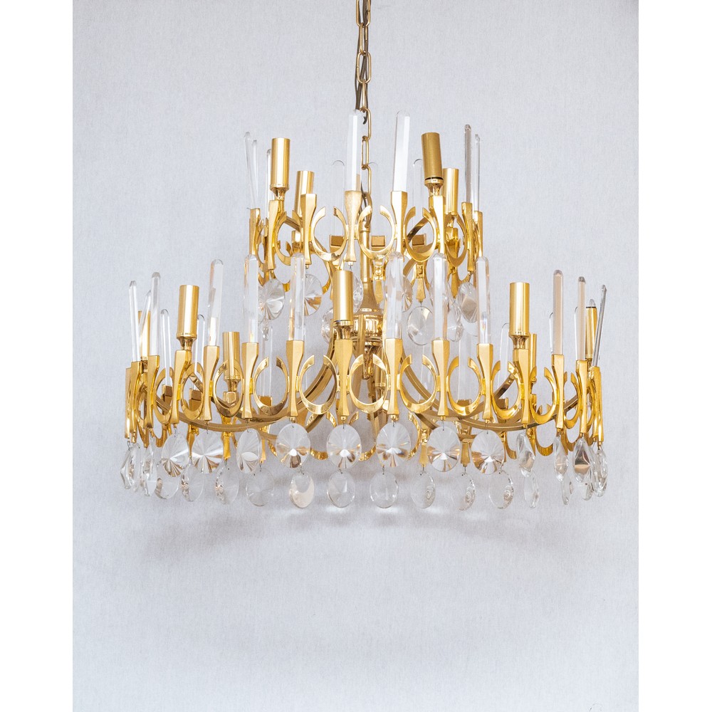 Lampada a sospensione a 12 luci con struttura in metallo dorato, corpo composto da due piani circolari sovrapposti, decoro ad ovuli con cristalli incolore a lancia sfaccettati e gocce in cristallo incolore conico. Impianto elettrico originale.