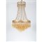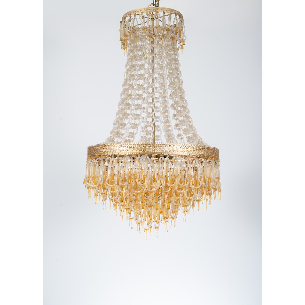 Lampada a sospensione con struttura in metallo bagno oro, decorato con catene e pendenti in vetro soffiato incolore ed ambra. Difetti.