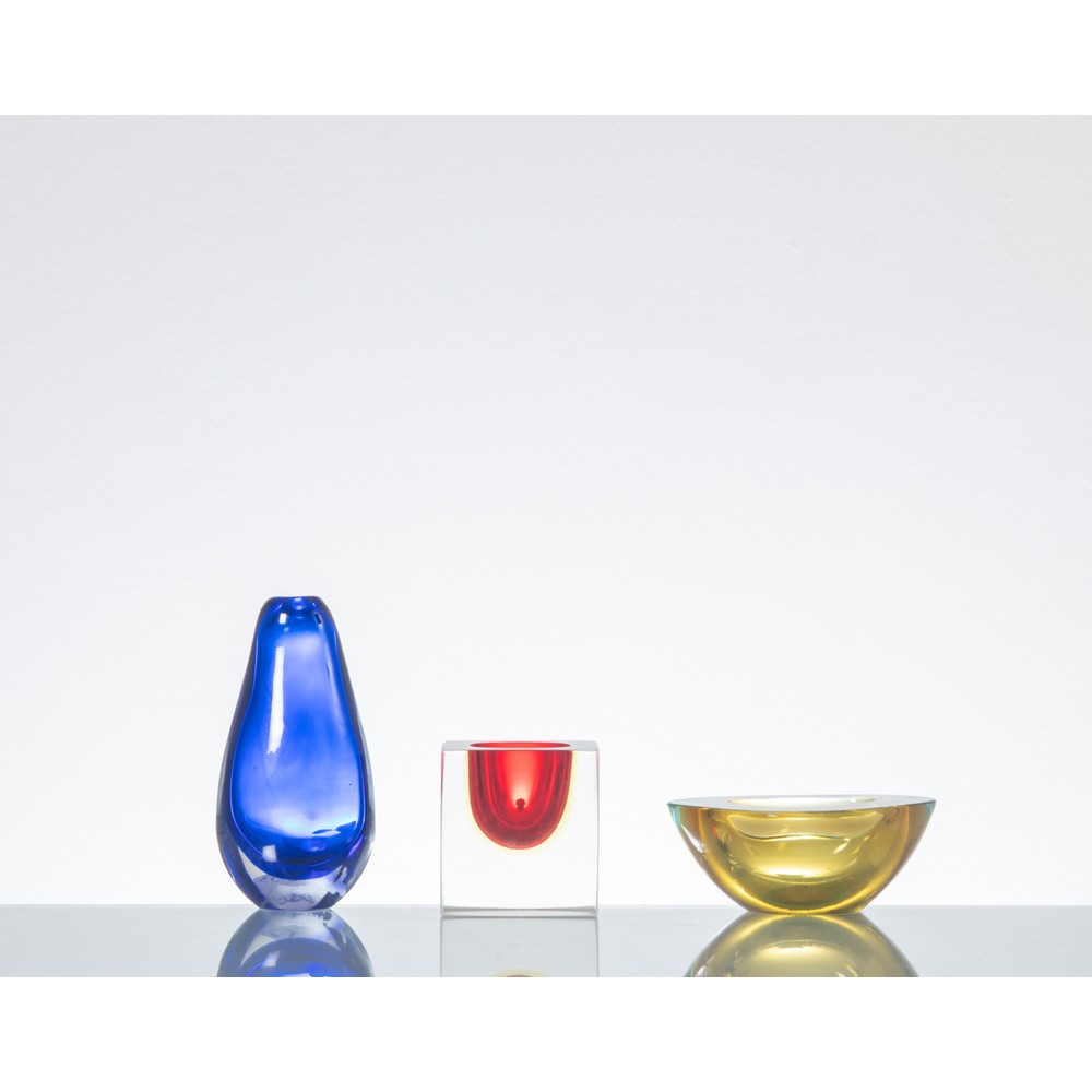 Tre vetri: vaso a goccia in vetro sommerso incolore e blu, vaso cubico in vetro sommerso incolore e rosso ed una coppa semicircolare in vetro sommerso pagliesco. Lievi difetti.