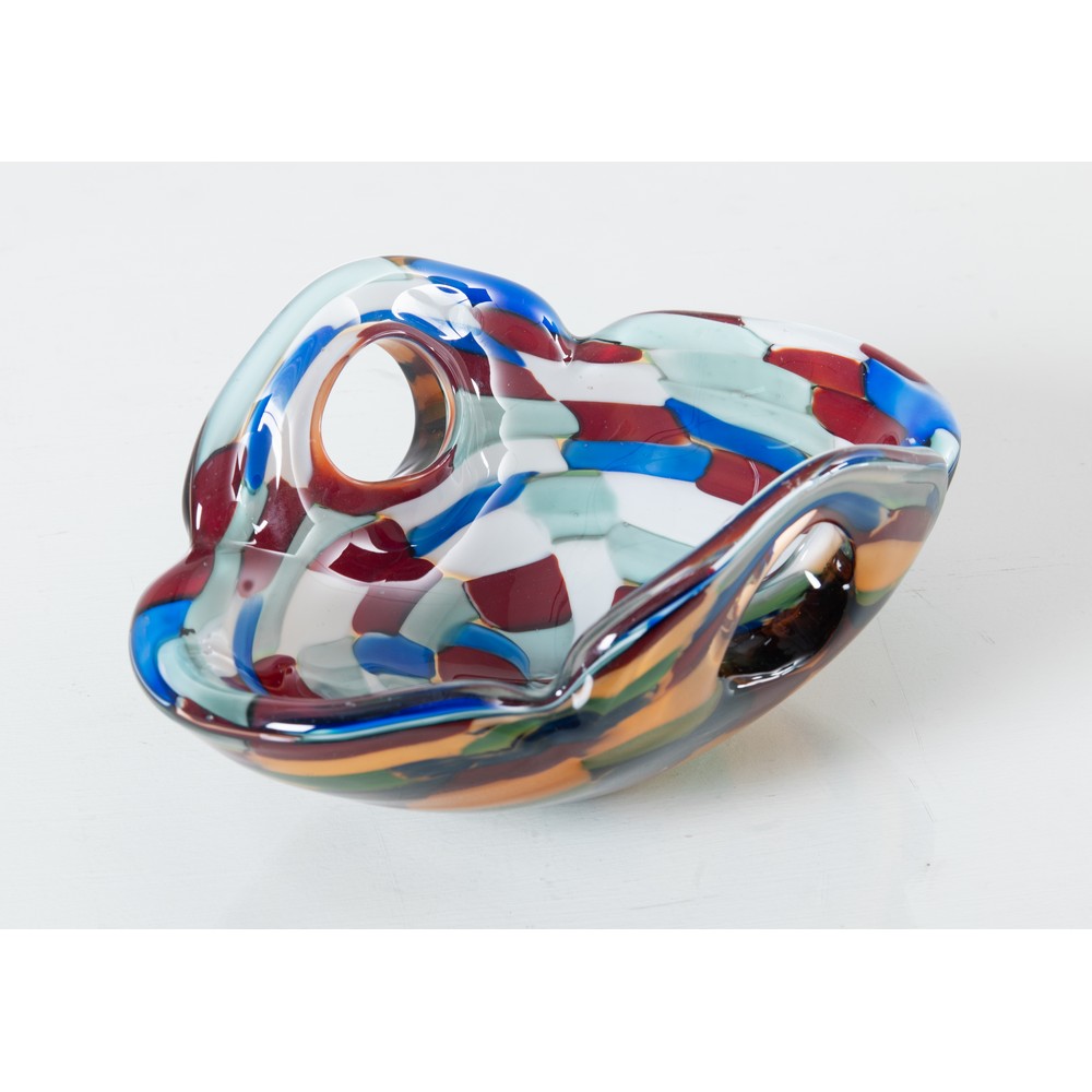 Centrotavola in vetro arlecchino, verde, blu, rosso e lattimo, corpo a paniere con due manici laterali.