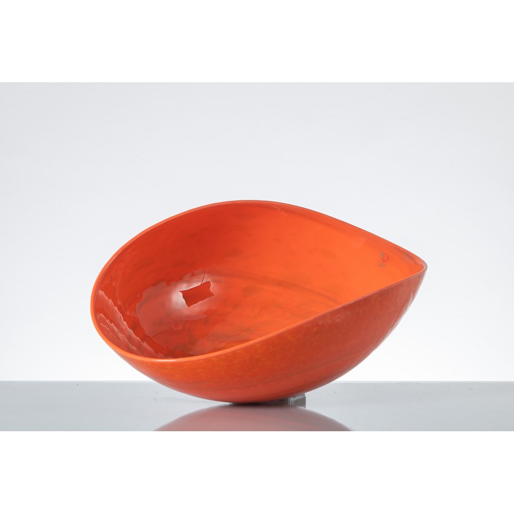 Centrotavola in vetro arancione e bruno, corpo semisferico con bordo ondulato, bocca piana. Etichetta del consorzio maestri muranesi.