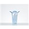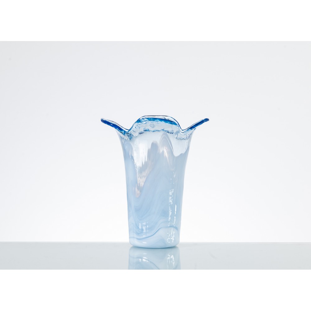 Vaso in vetro incolore decorato con sfumature lattime, corpo a campana con costolature sottili, bocca ondulata e quadripartita a petali bordati di blu.