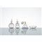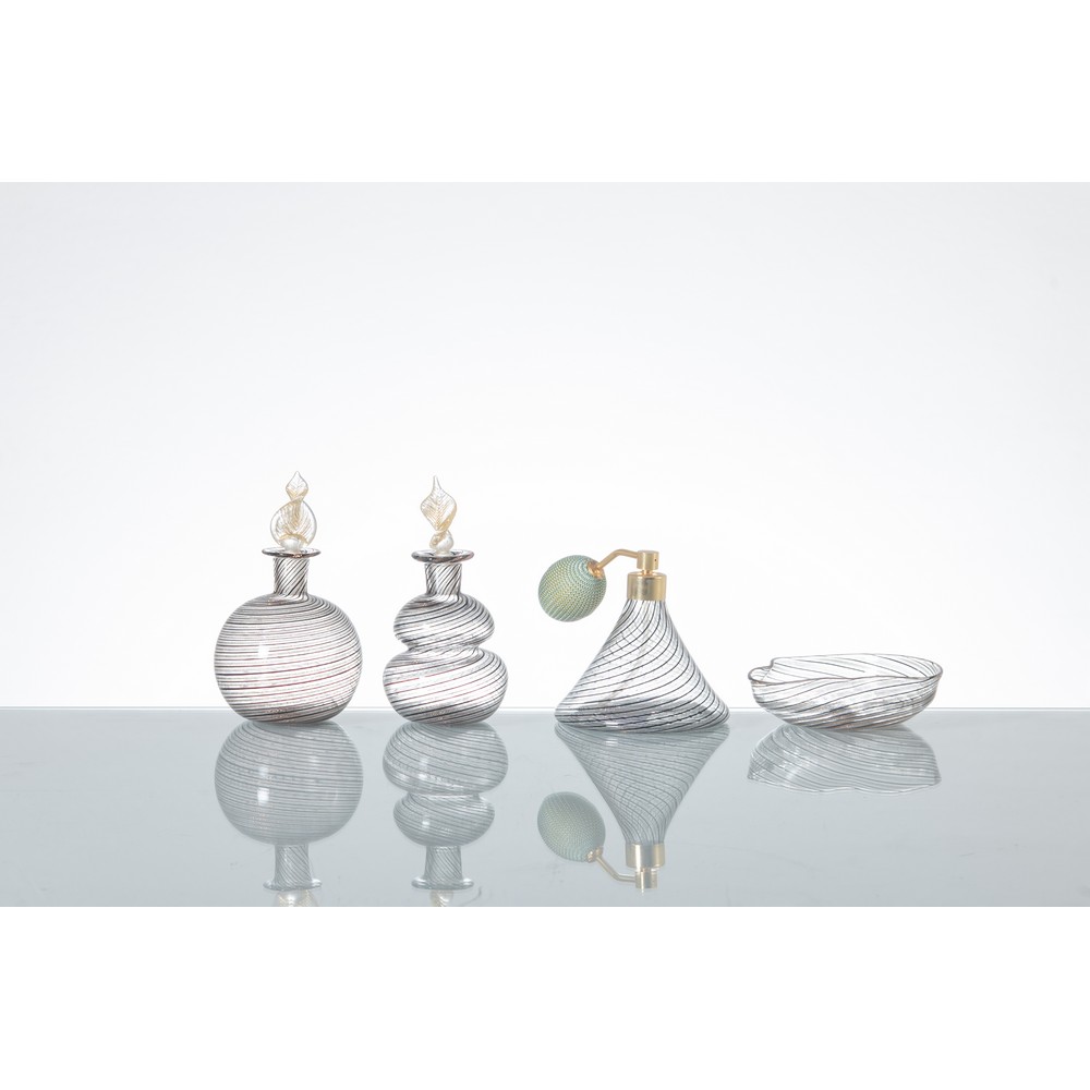 Set da toletta in vetro soffiato e decorato con filigrana nera composto da quattro pezzi, due ampolle porta profumo con tappo dorato, una bottiglia con vaporizzatore ed una ciotola con bocca sagomata.