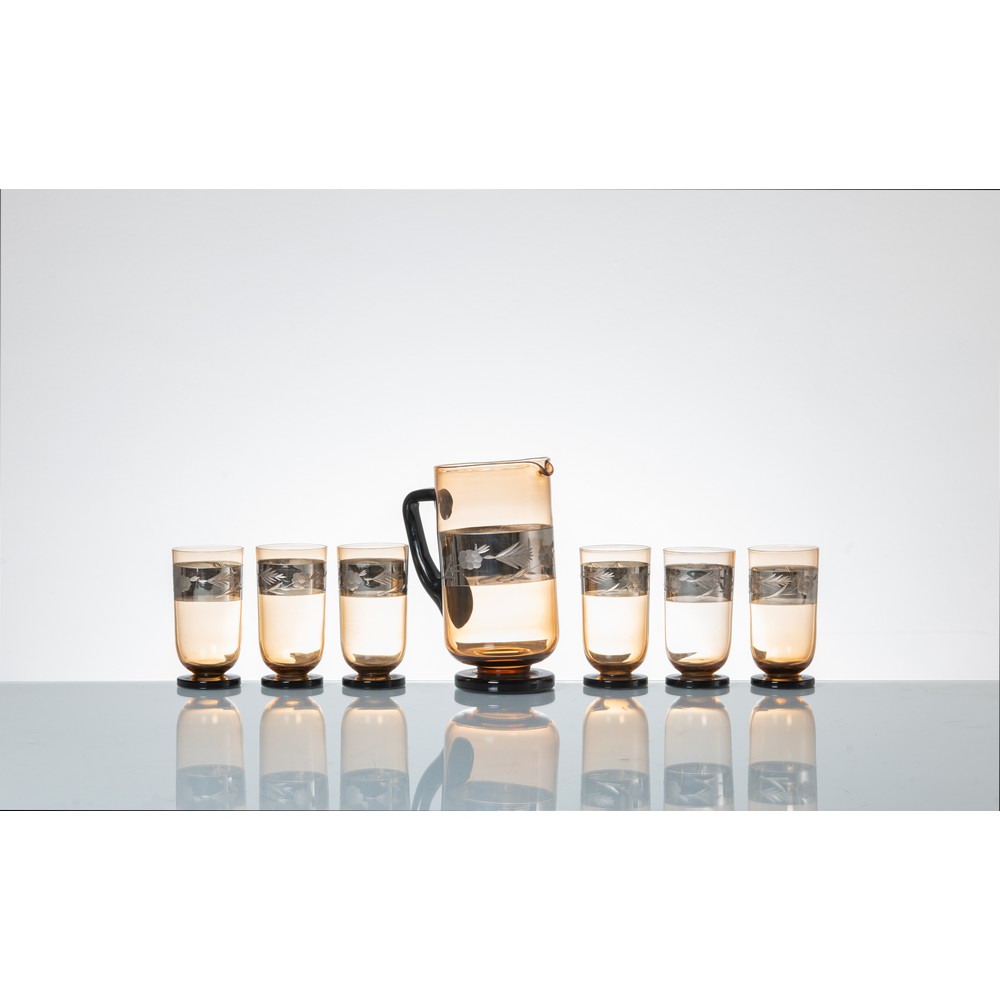 Sei bicchieri ed una caraffa in vetro ambra decorati con incisioni floreali su fascia grigia.
