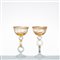 Due calici in vetro soffiato incolore e pagliesco, gambo composto da anelli tortili, coppe incise e decorate in oro con tralci, bocca circolare bordata in oro.