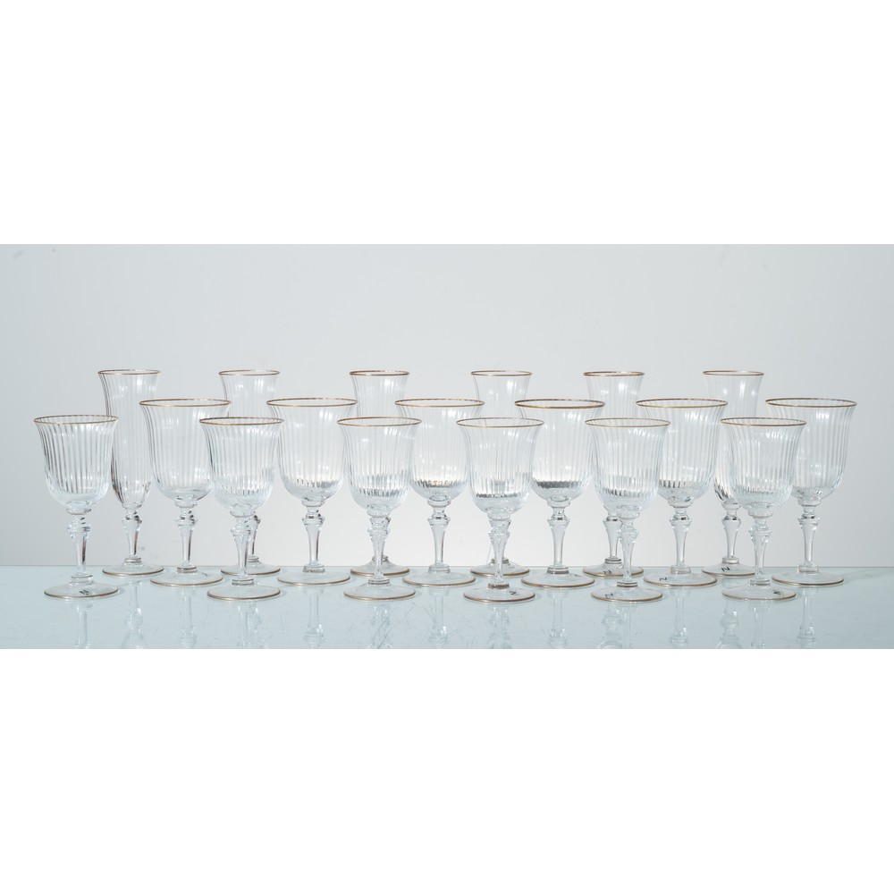 Servizio di bicchieri a calice in vetro soffiato incolore bordo oro, coppa bacchettata, composto da sei bicchieri acqua, sei bicchieri vino e sei flutes champagne. Etichetta di produzione.