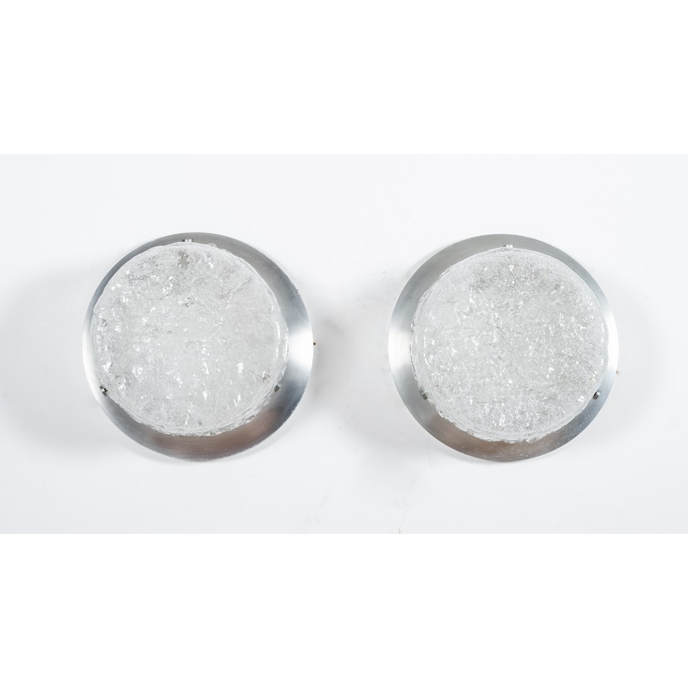 Coppia di lampade da soffitto o parete ad una luce, struttura in metallo cromato con diffusore circolare in vetro incolore ghiacciato. Segni del tempo