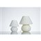 Due lampade da tavolo ad una luce modello “Mushroom”, in vetro lattimo decorato con rigature diagonali, di dimensioni differenti.
