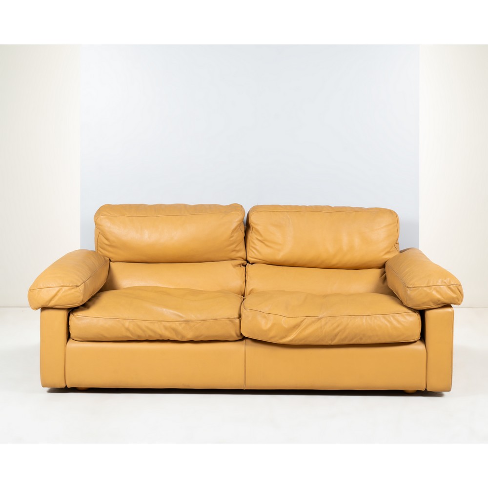 Divano a due posti modello “Petronio”, struttura in legno con imbottitura in piume d’oca e crini, rivestimento in pelle cognac, piedi in faggio. Marchio di produzione. Strappi e usure.