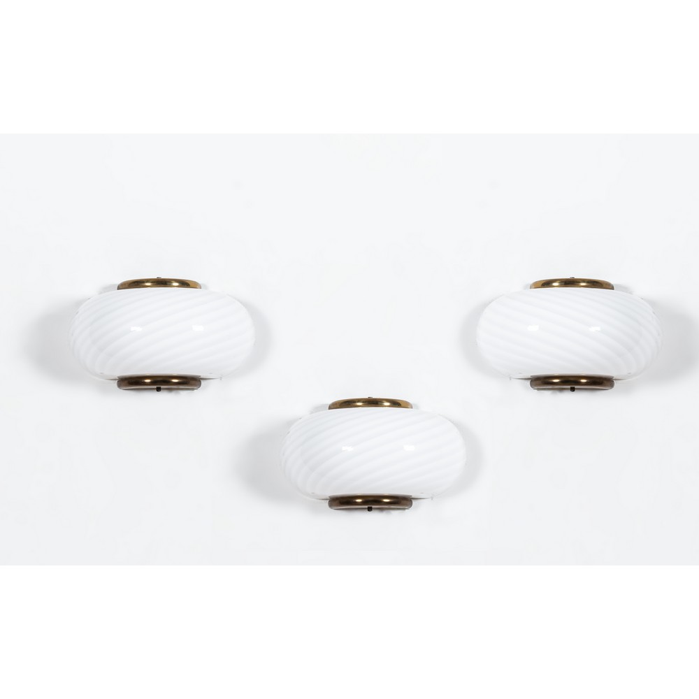 Tre lampade da parete ad una luce, struttura in metallo dorato, diffusore semicircolare in vetro lattimo con decoro a spirale in tono più chiaro.