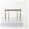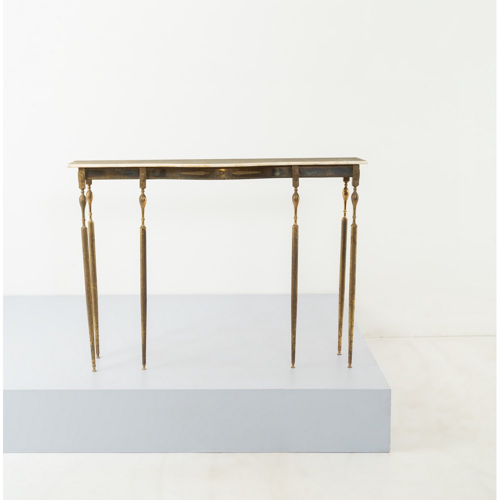Consolle in ottone con sei gambe scanalate e sagomate, fronte decorato con fregi classici, piano in marmo chiaro. Segni di uso.
