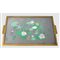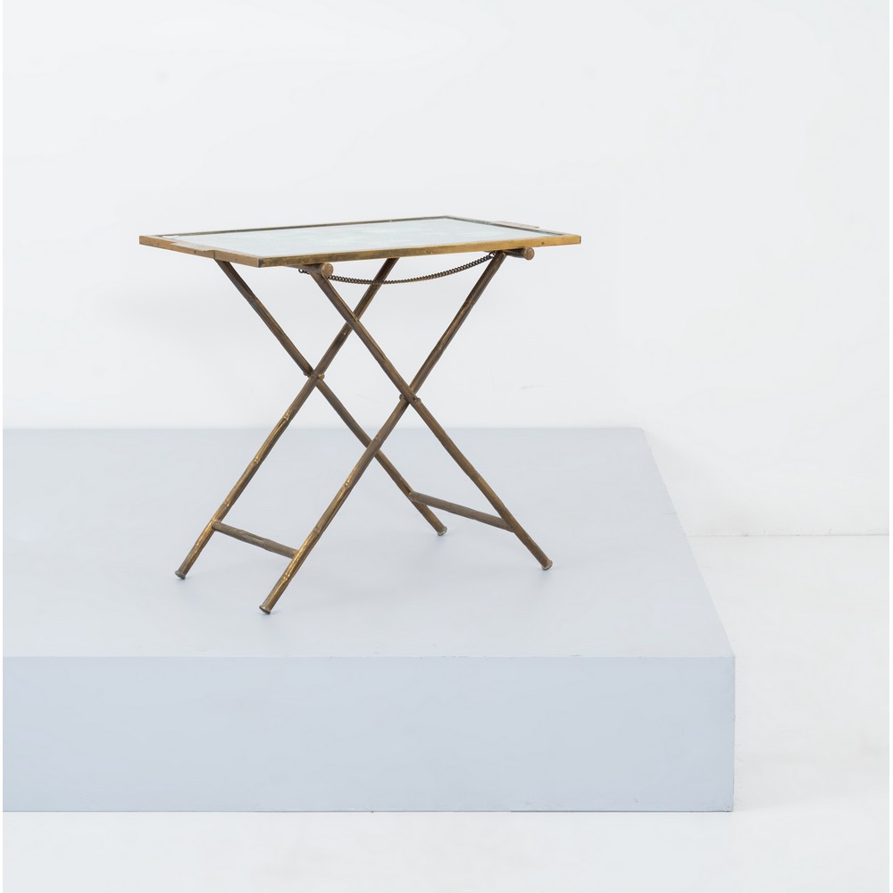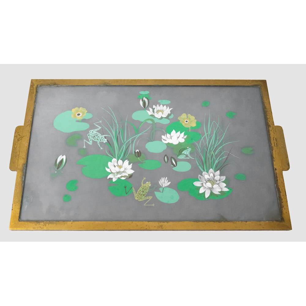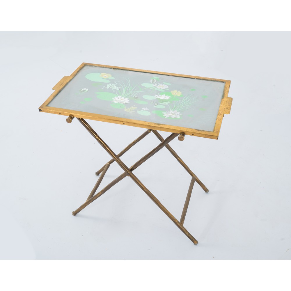 Tavolo ripieghevole con vassoio, struttura in ottone a canna di bamboo, vassoio amovibile rettangolare, piano decorato con ninfeee e ranocchi. Segni di uso e lievi ossidazioni.