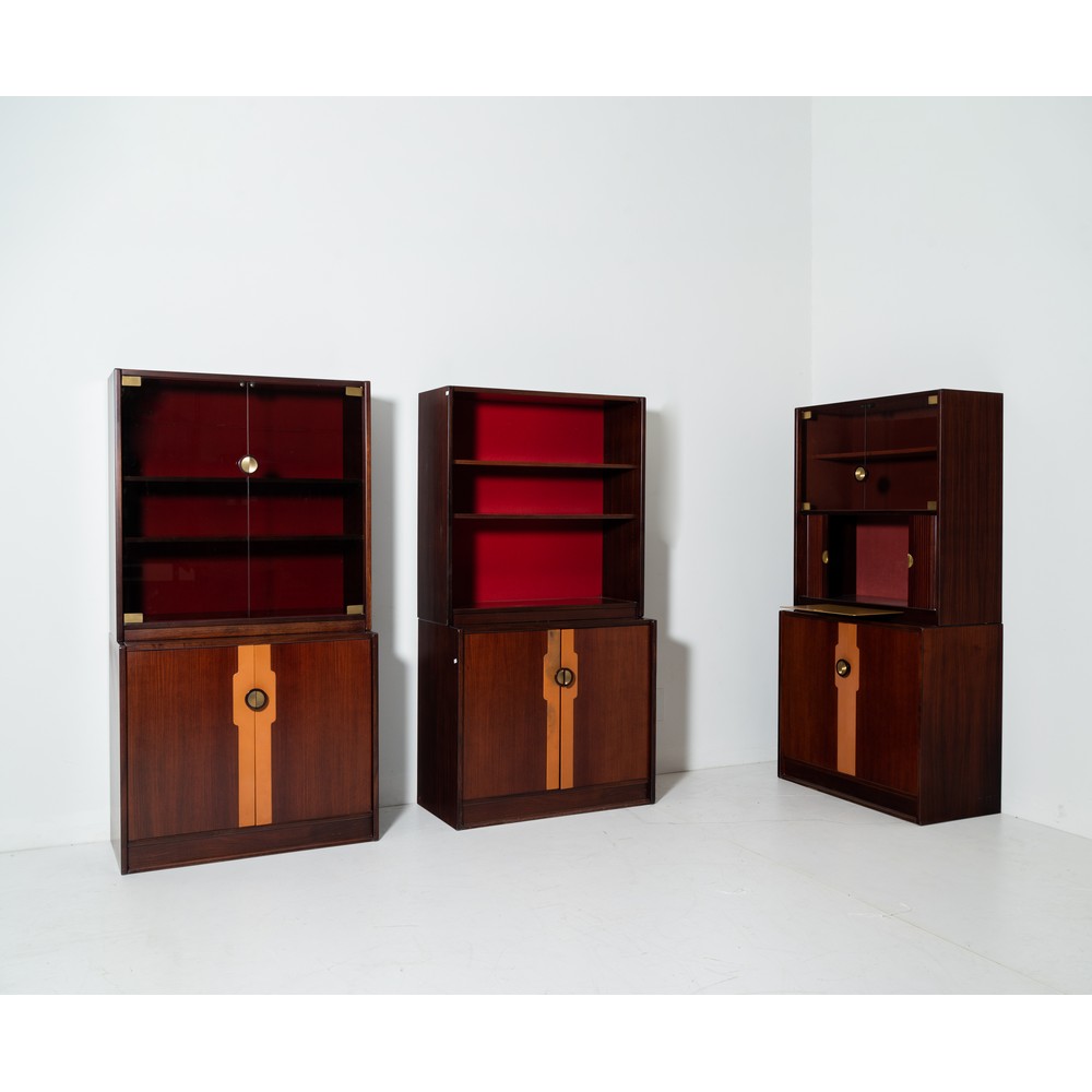 Mobile contenitore alto in legno esotico composto da tre elementi, sul fronte nella parte posteriore ciascuno ha un vano chiuso con due ante battenti decorate con motivo geometrico in pelle marrone, sulla parte superiore un vano chiuso con ante battenti in vetro fumè, un vano con mensole a giorno ed un vano chiuso con ante battenti in vetro fumè con sottostante vano bar chiuso con ante a serranda scorrevole in legno e con ridetto a scomparsa, minuterie in metallo dorato. Segni di uso e difetto alla pelle.