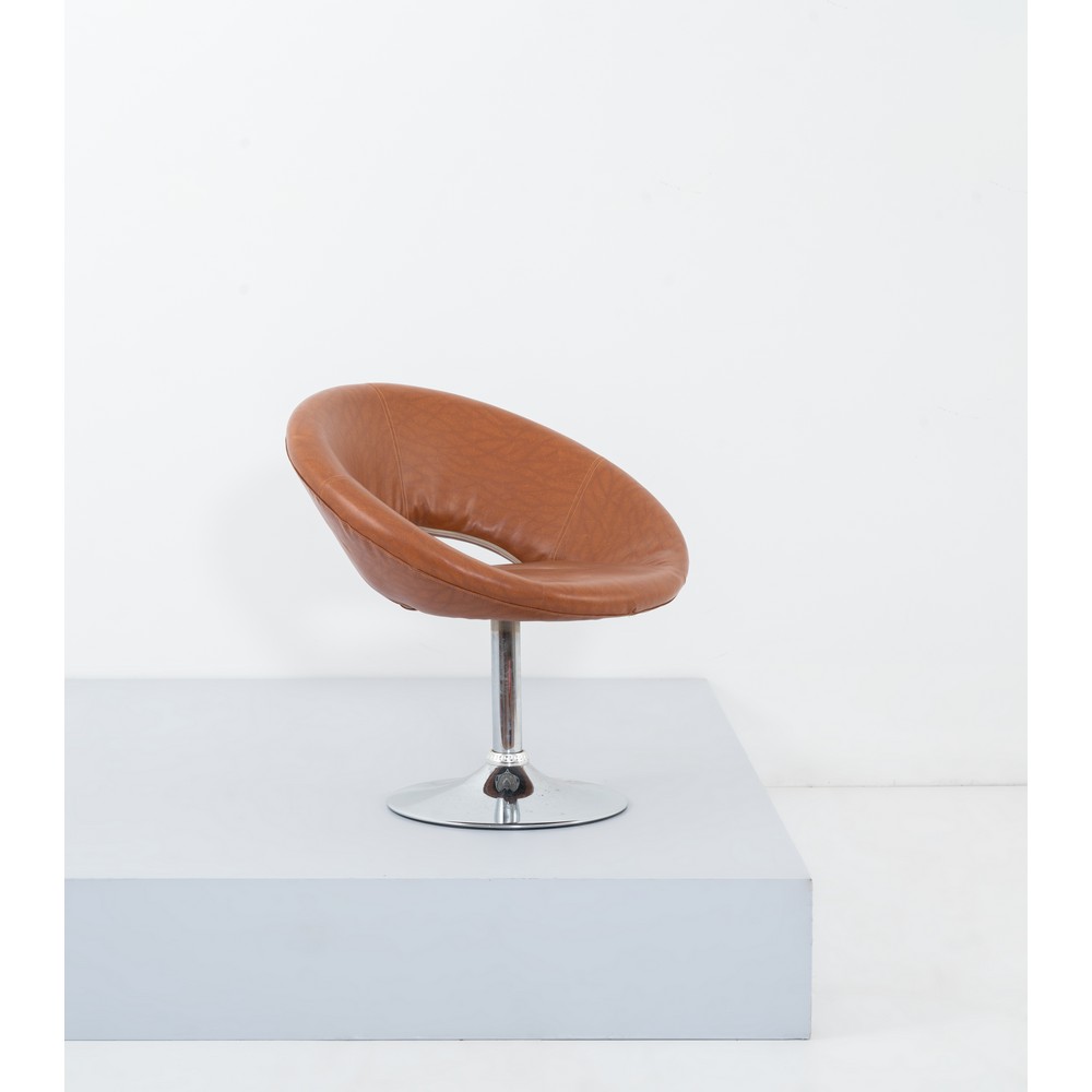 Poltrona con piede a tromba in metallo cromato, seduta e spalliera con imbottitura e rivestimento in pelle marrone.