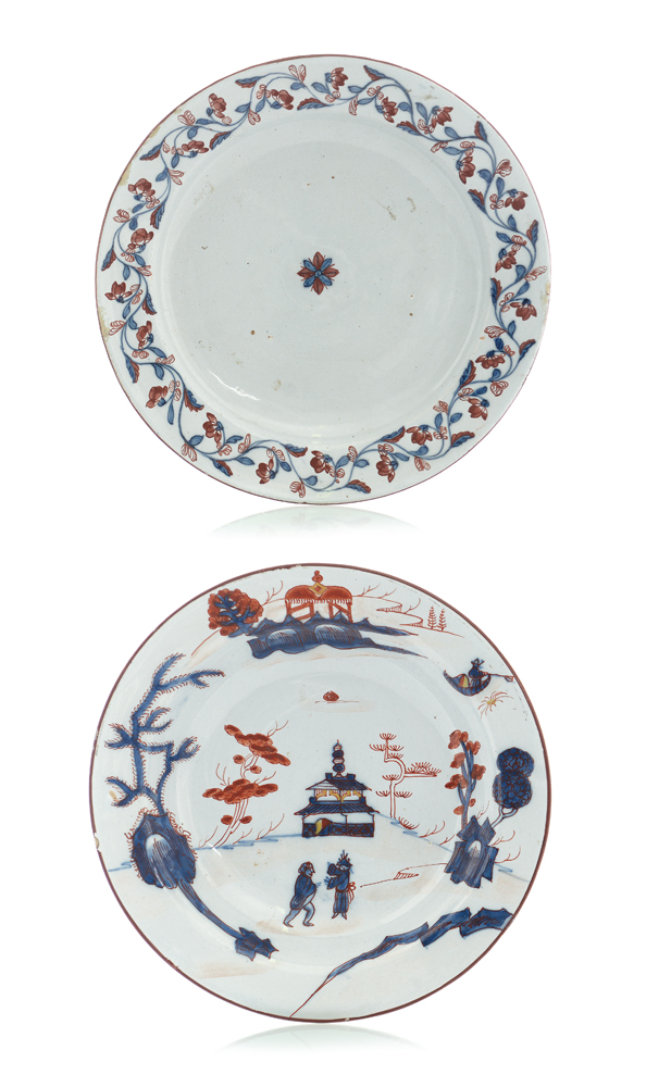 DUE PIATTI IN MAIOLICA, MILANO, P.RUBATI, XVIII SECOLO, decoro "al carabiniere" e a motivi floreali; lievi difetti.