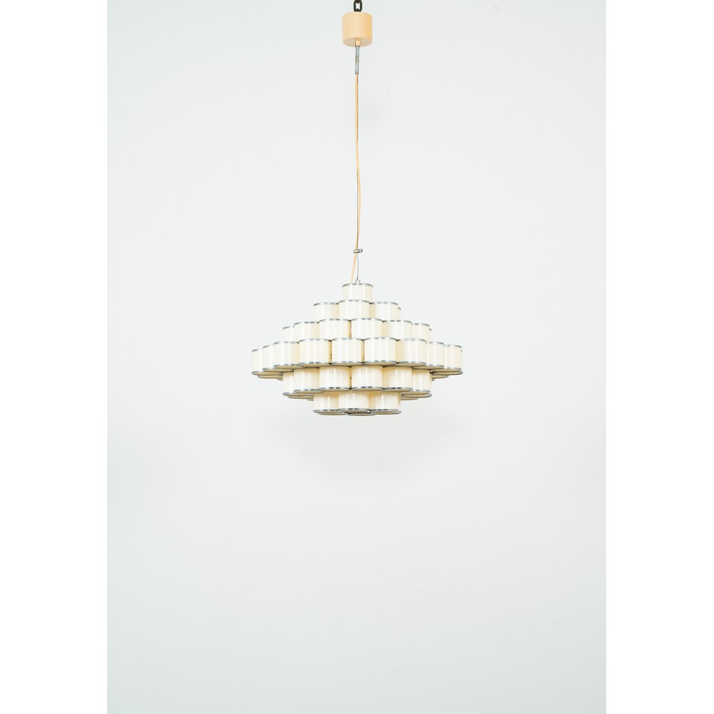 Lampada a sospensione a tre luci, struttura in metallo, diffusore composto da cilindri in metallo cromato e perplex lattato.